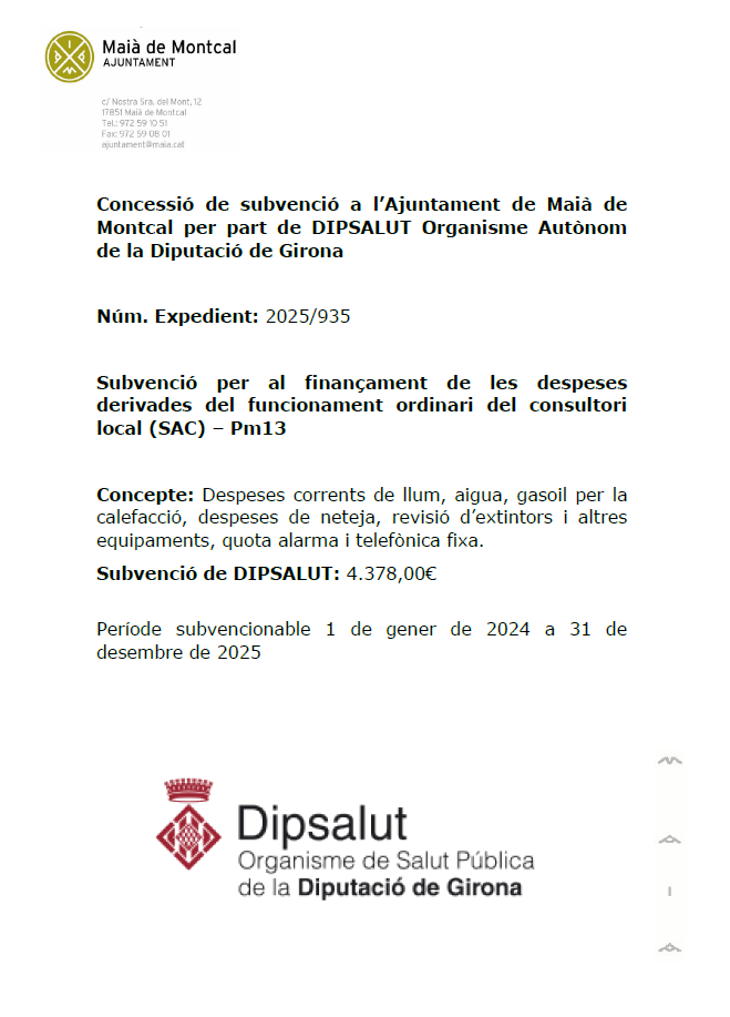 Actualitat, Agenda, General Subvenció de Dipsalut pel finançament de les despeses derivades del funcionament ordinari del consultori local (SAC)- Pm13