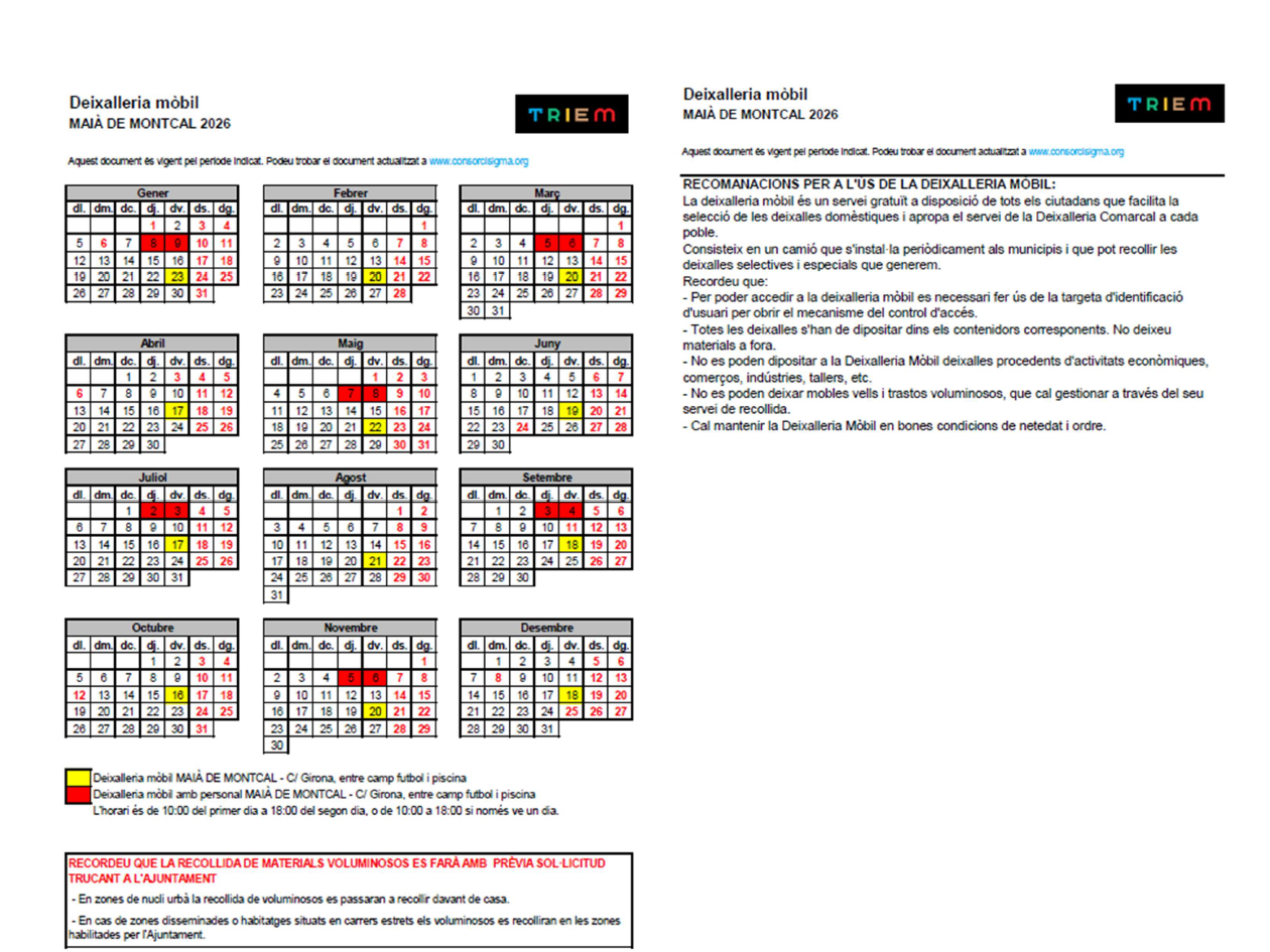Calendaris de recollida de voluminosos i deixalleria mòbil Calendari del Servei de Deixalleria mòbil 2026 Servei de recollida de materials voluminosos 2026 Informació deixalleria mòbil 2026